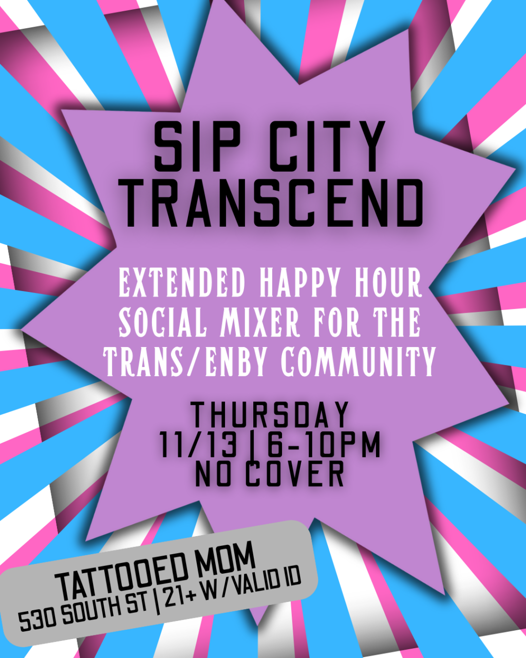 Follow @Sip City Mixer and @Sip City Transcend on Instagram for more LGBTQ women/trans events!