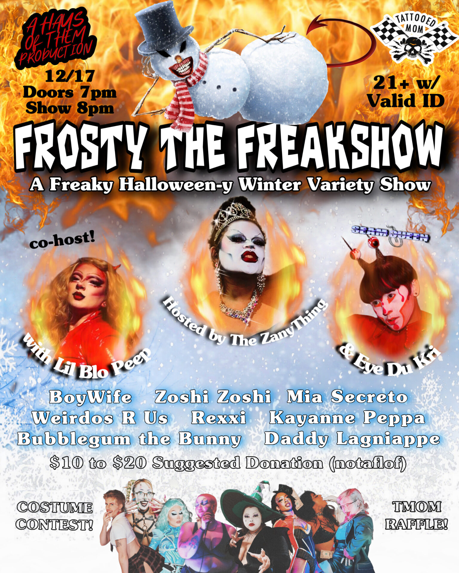 Do you miss Halloween during the winter holidays? Look no further! Haus Of Them invites you to celebrate everything freakish and Halloween-ish at Frosty The FreakShow! Drag, burlesque, clown, sideshow, live vocals, and more are on the agenda! We’ve got a costume contest with a sick prize and a Tattooed Mom swag (comes with a gift