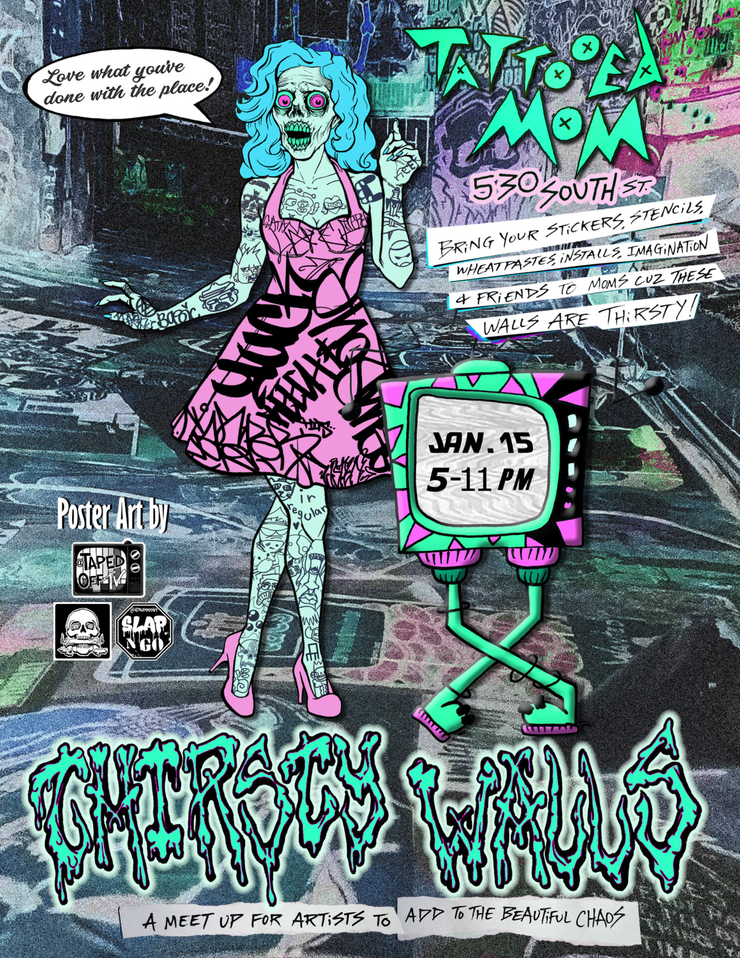 From the first tag to the latest wheat paste, upstairs at TMom’s has been home to a rich history of local & international street art. This is an ever changing gallery: an un-curated & spontaneous outpouring of creativity by local & traveling artists and the countless visitors who leave their unique mark here nightly.