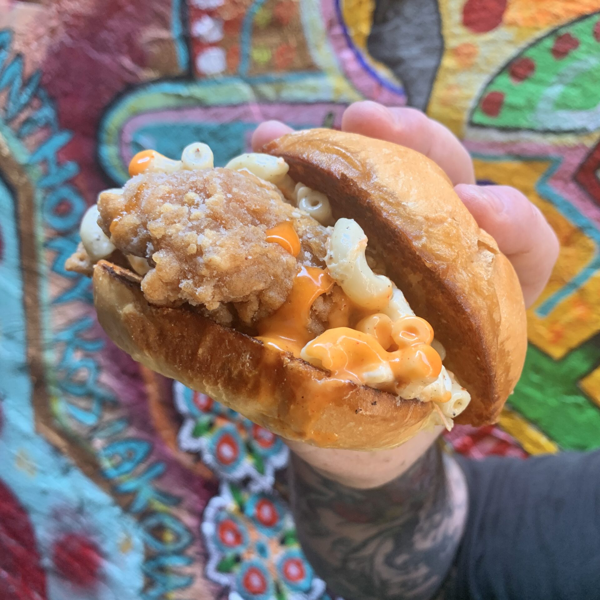 Vegan Mochiko Chickn, Hawaiian Mac Salad, Gochujang Aioli, Su-Miso Sauce on a Merzbacher’s Sweet Potato Brioche Bun