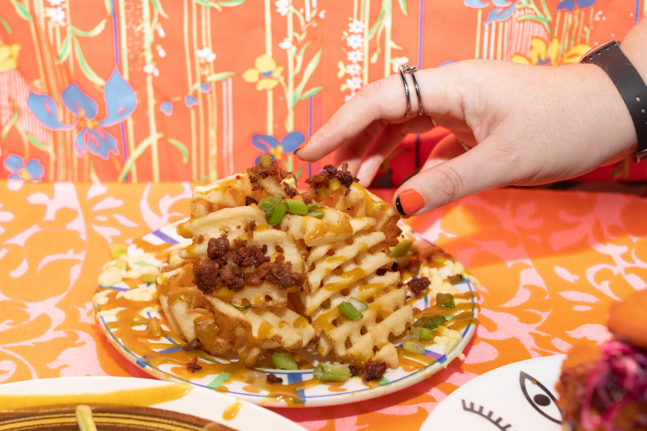 TMoms Famous Waffle Fries, Japanese Curry Pork, Curry Kewpie Mayo, Toasted Sesame, Fresh Scallions