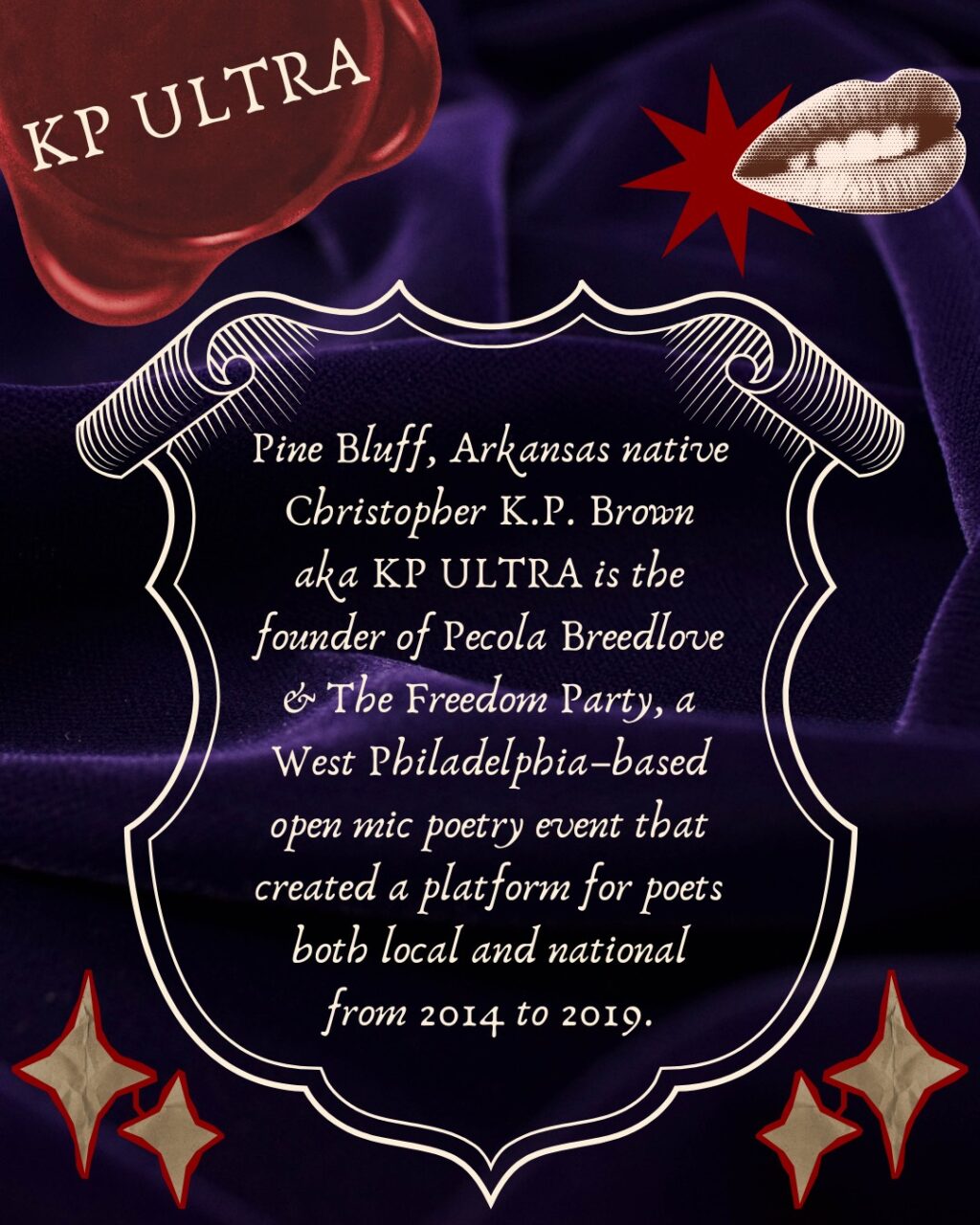 Pine Bluff, Arkansas native Christopher K.P. Brown aka KP ULTRA is the founder of Pecola Breedlove & The Freedom Party, a West Philadelphia–based open mic poetry event that created a platform for poets both local and national from 2014 to 2019. Prior to Breedlove, he ran a Philadelphia based small press named 2 Pens & Lint, under which he published chapbooks for over 400 poets. He currently runs Poetry215.com, an online poetry calendar where you can find upcoming poetry events in Philadelphia. His newest poetry book and album is titled 84 ULTRA. It includes the poems The Process, This Ain’t That, and Kiss The Sky. The project is available at 84ULTRA.com He is a graduate of Mercer University where he majored in African American Studies with minors in Creative Writing and Studio Art. When he isn’t working on poetry, he enjoys doing genealogy work for his family tree research company, Before They Were Ancestors, LLC.