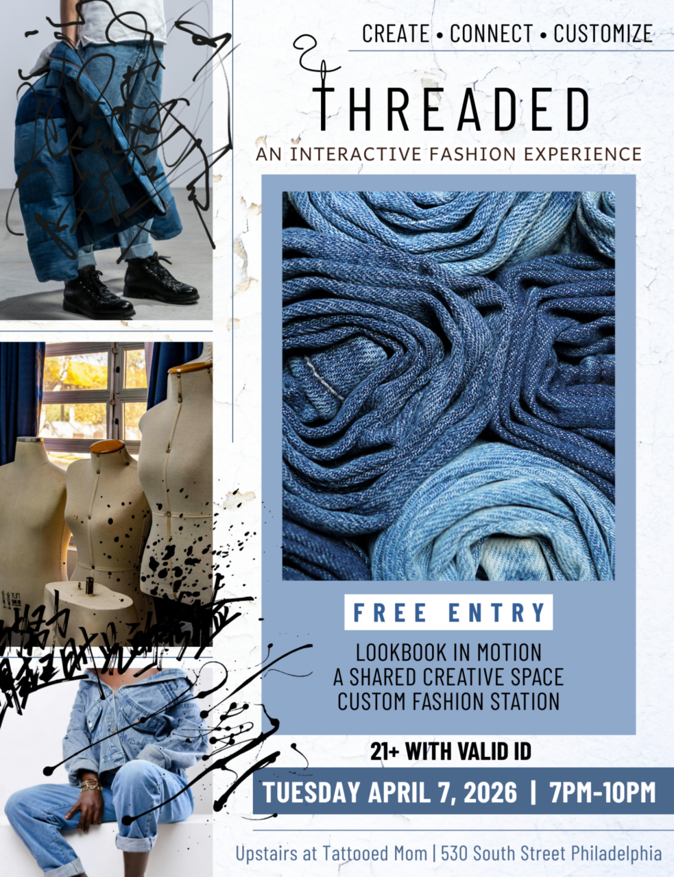 THREADED is an interactive fashion experience featuring live models showcasing local designers throughout the space, creating a “lookbook in motion.” Guests can connect with creatives and customize their own fashion piece at our hands-on fashion station. Free entry, 21+ with valid ID.