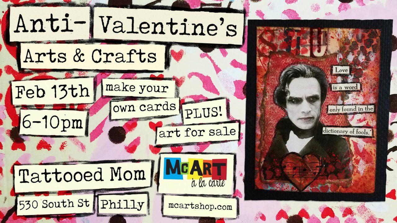 Don’t drink and text….vex the ex with some biting art. Join Mixed-Media Artist Susan Rae Sager and McArt à la Carte to create anti-Valentine’s collage cards using paper, stencils, stamps, and all of the sarcasm.