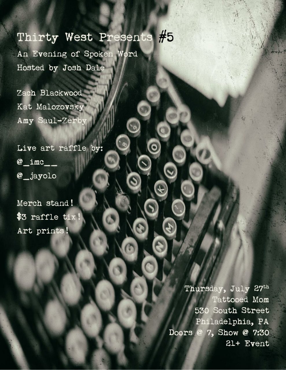 Thirty West Presents returns for an evening of poetry and live readings by local Philadelphia authors. Plus, a live art raffle will take place between readings. $3/ticket for your chance to WIN!