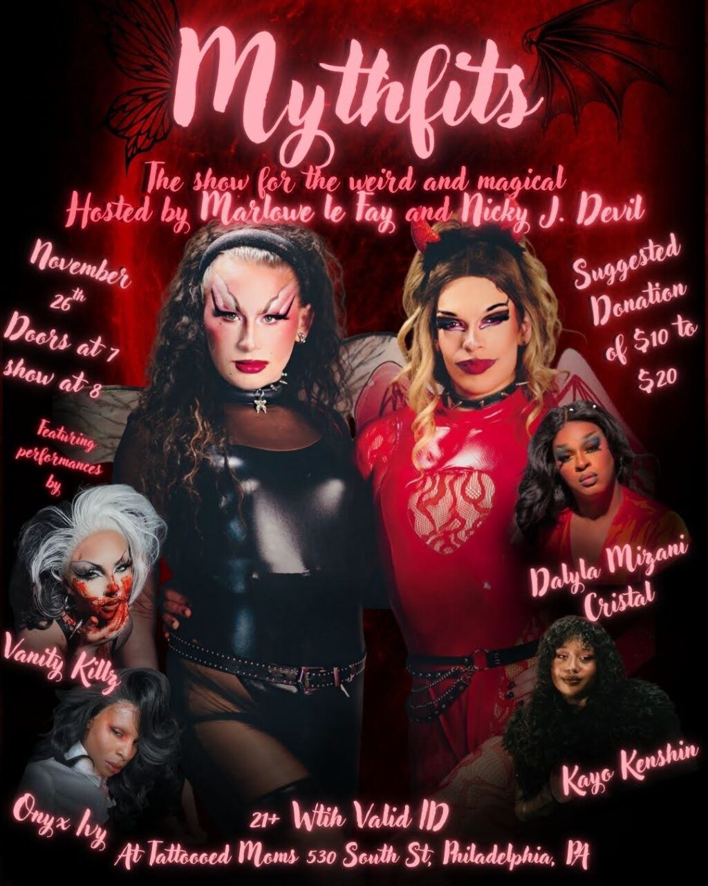 Mythifts is a variety show for the weird and magical. We have acts ranging from drag, to burlesque, to live singing. Hosted and Headlined by The Trans Fairy Goddess of Philadelphia, Marlowe le Fay, and Phillies Jersey Devil Hooker, Nicky J. Devil, we take you into our dark and magical realm through our performances. We give shows ranging from beauty and elegance to horror and grunge. So be there to be entranced by our magical oddities and beauties on November 26th at 7pm.