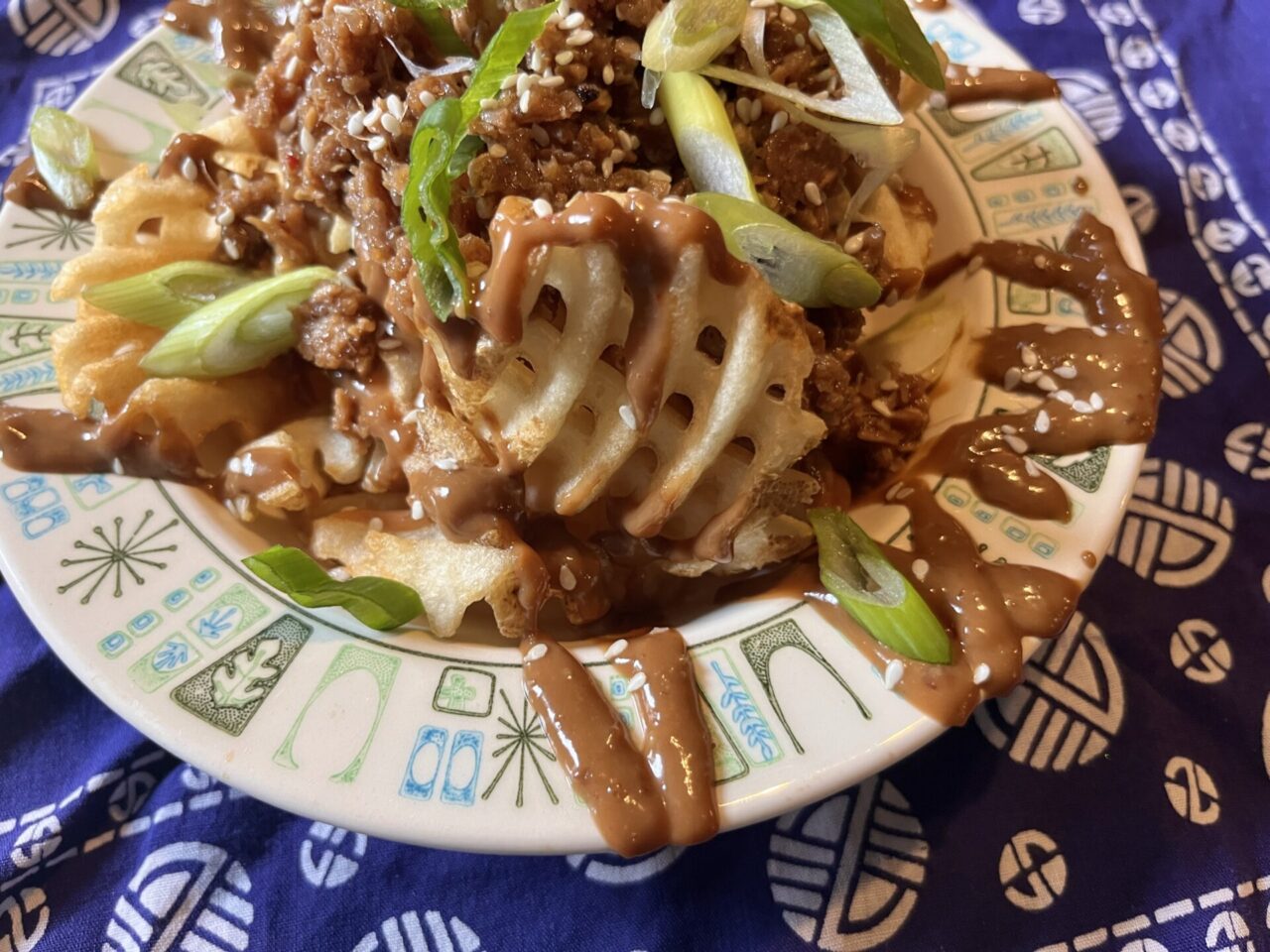 • Mom’s Famous Waffle Fries, Dan Dan Sauce, Vegan Ground Pork, Fresh Scallions