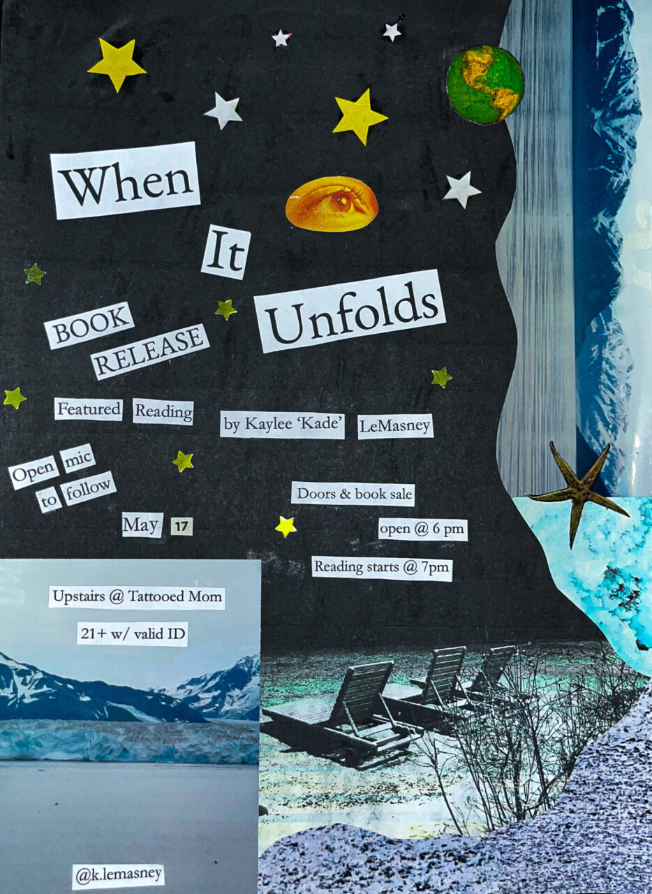 Have you ever wondered what’s beyond the veil? Join Kaylee ‘Kade’ LeMasney on May 17th for their premiere release of When It Unfolds. This self published piece explores themes of grief, uncertainty and divinity. Copies will be on sale on May 17th upstairs at Tattooed Mom. Doors and book sale will begin at 6pm. A featured reading by the author will begin at 7pm with a poetry open mic to follow. 21+ w/ valid ID.
