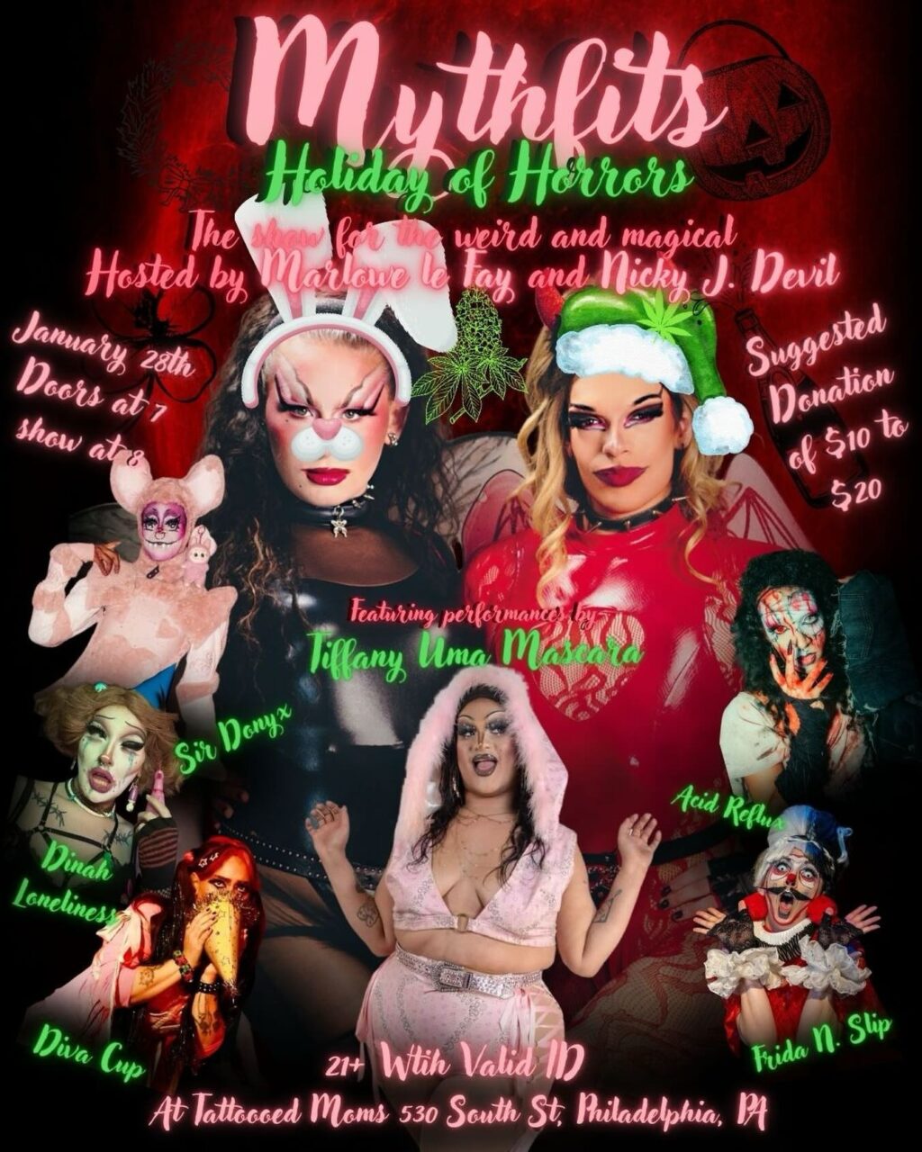Mythifts is a variety show for the weird and magical. We have acts ranging from drag, to burlesque, to live singing. Hosted and Headlined by The Trans Fairy Goddess of Philadelphia, Marlowe le Fay, and Phillies Jersey Devil Hooker, Nicky J. Devil, we take you into our dark and magical realm through our performances. We give shows ranging from beauty and elegance to horror and grunge. So be there to be entranced by our magical oddities and beauties on January 28th at 7pm.