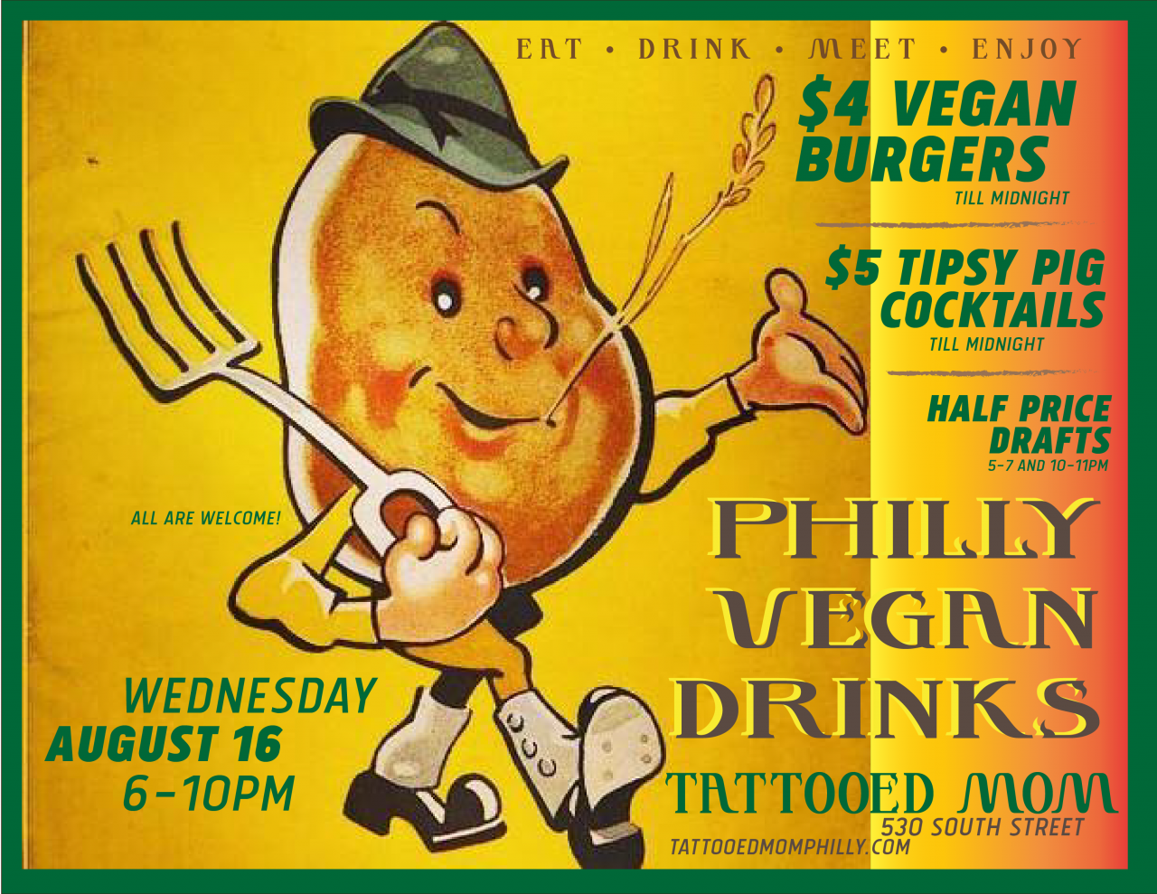 Join our friends from the Humane League of Philadelphia for a $4 vegan burgers & half priced draft beers at August’s edition of the monthly Philly Vegan Drinks meet up. Meet with other local vegetarians and vegans in a fun, casual environment, & try our delicious vegan menu! Eat, drink, & enjoy…locally, consciously, and, deliciously.