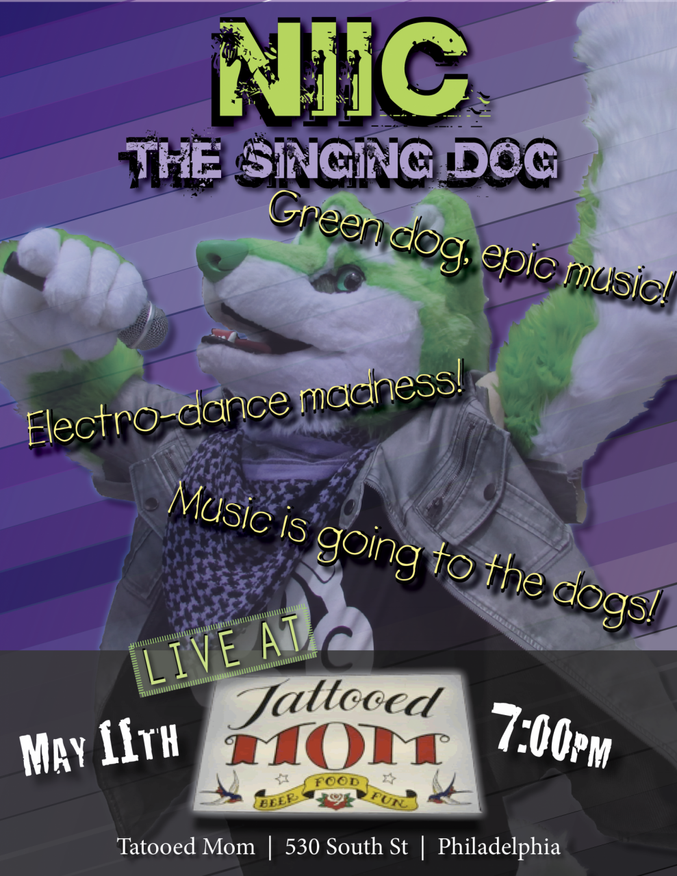 You’ve seen him around town, now catch NIIC the Singing Dog as he rocks out to original music. This act is ONE NIGHT ONLY and it’s guaranteed to rock your socks! Come party with the fun, green Singing Dog!