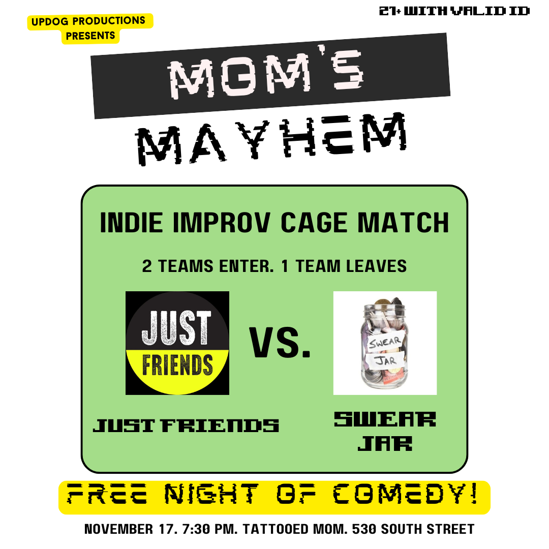 Can you smellllll what Mom’s Mayhem is cooking? Indie Cage Match is back baby! And it’s only at Tattooed Mom! Come on out and see two of Philadelphia’s best indie improv teams fight it out in the Mom’s Mayhem cage. Two teams enter, one will win the belt! This month we have Swear Jar going up against Just Friends. These two heavyweights are sure to bring the PAIN. You don’t want to miss it. Doors open at 7, show starts at 7:30! See YOU there.