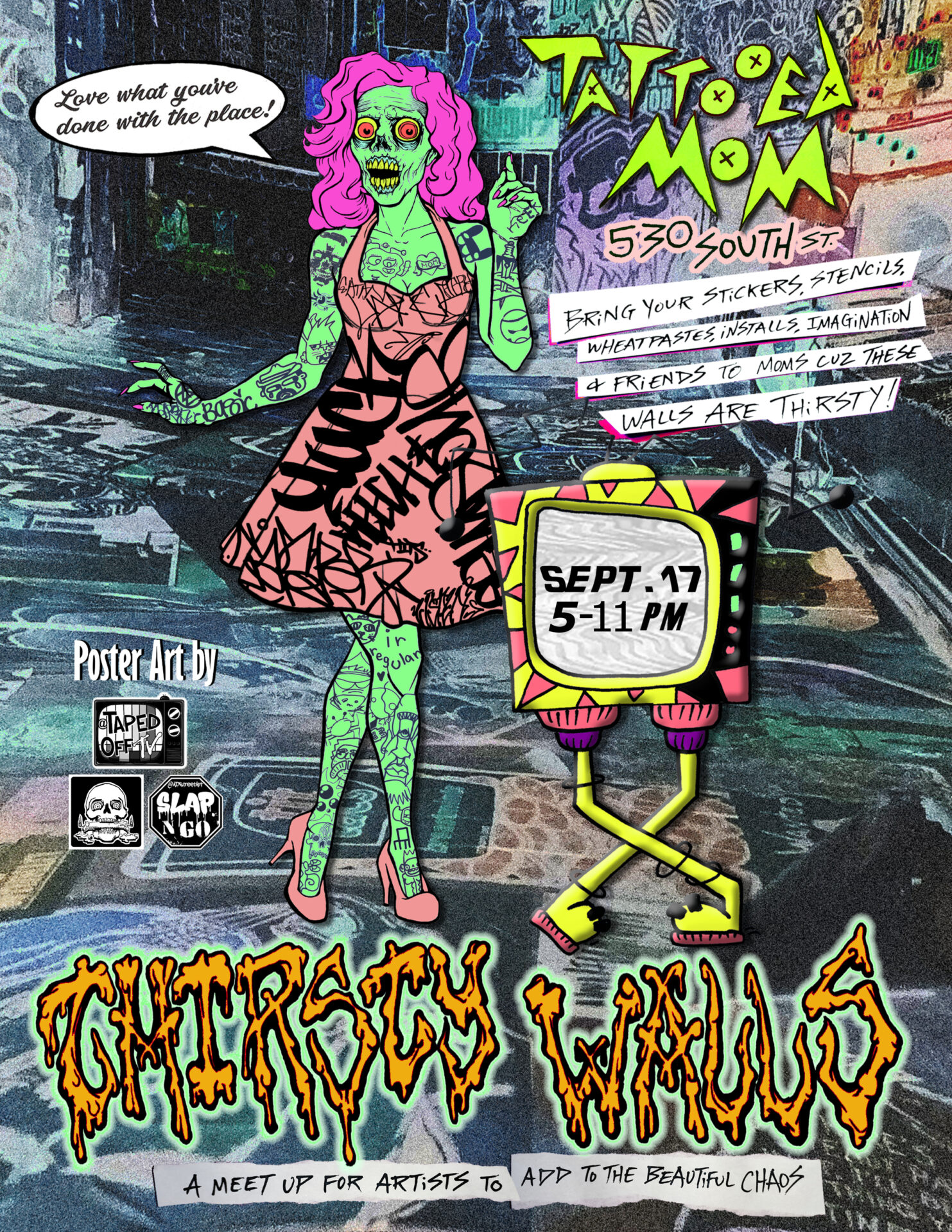 Calling artists of all kinds! Come out for an evening of slapping stickers, drawing on the walls, making art, and meeting other local artists! Thirsty Walls is a meet-up for artists to create and add to the beautiful chaos Upstairs at Tattooed Mom. Bring your stickers, wheatpastes, stencils, installations, imaginations & friends because these walls are THIRSTY.